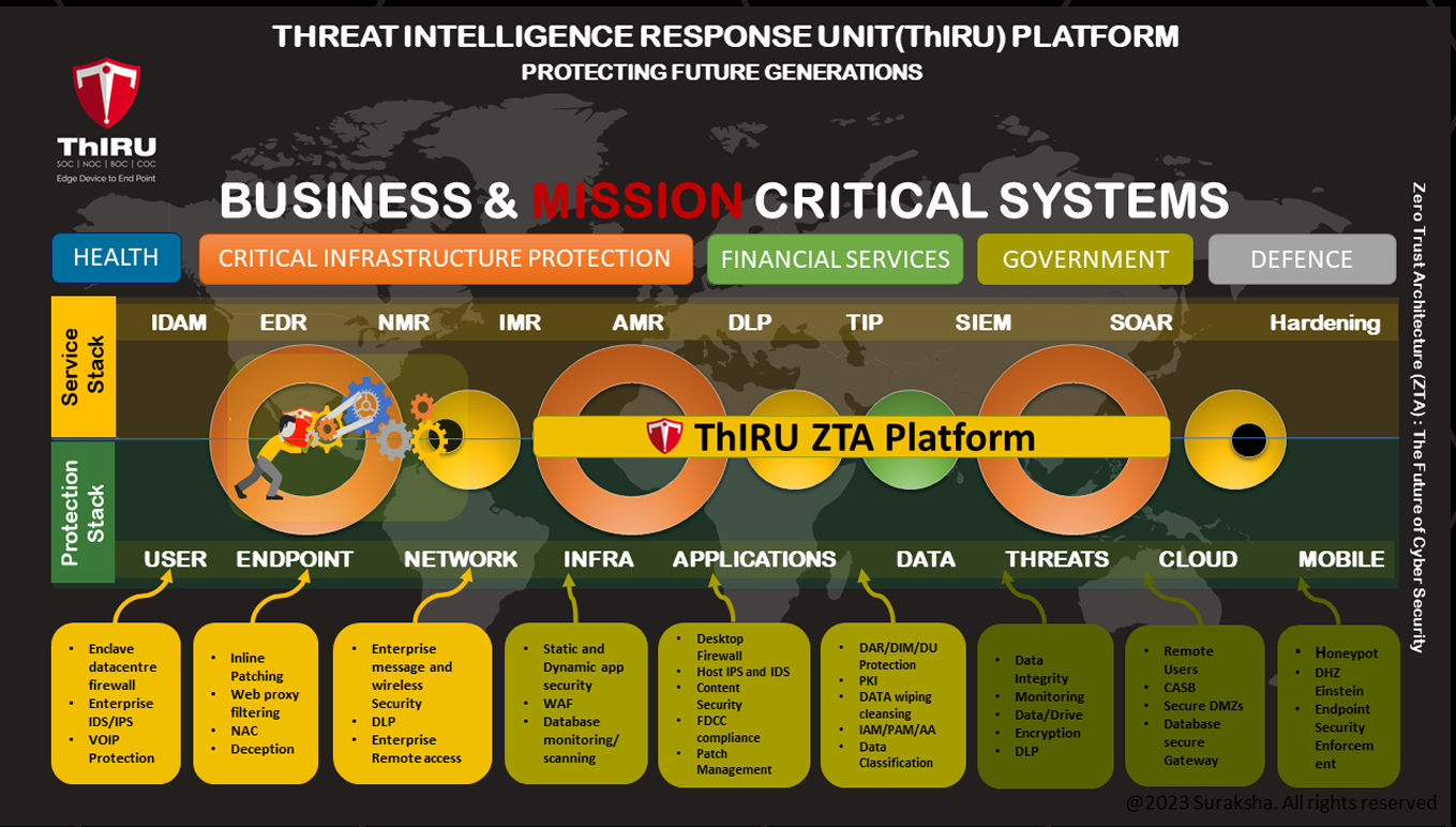 The ThIRU ZTA (Zero Trust Architecture) platform incorporates a wide spectrum of features — including identity and access management, endpoint detection, threat intelligence, network monitoring, and incident response. Designed with a zero-trust approach and proactive risk mitigation at its foundation, the platform empowers enterprises, financial institutions, government bodies, and defence agencies to secure mission-critical systems and sensitive data with unmatched resilience.